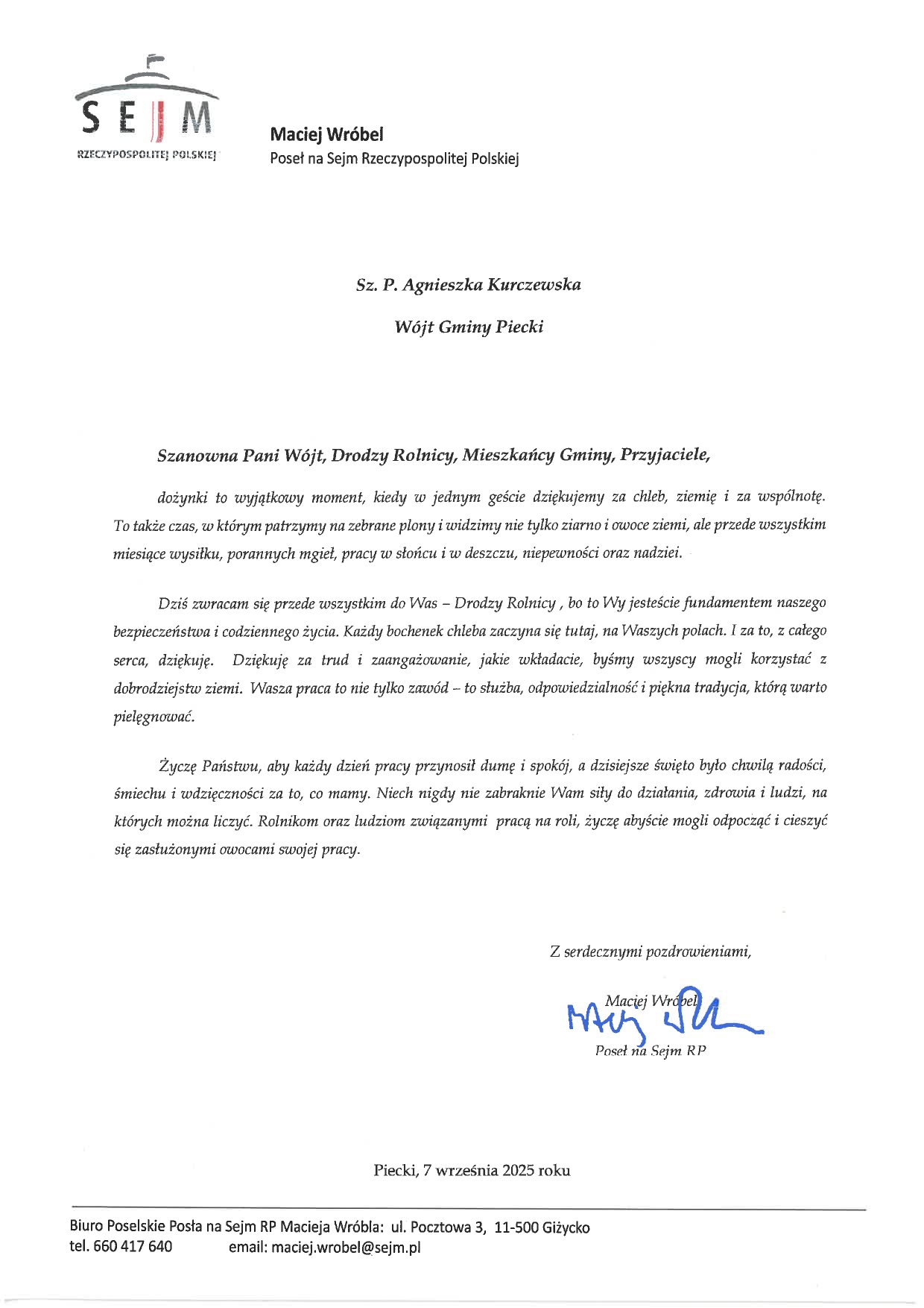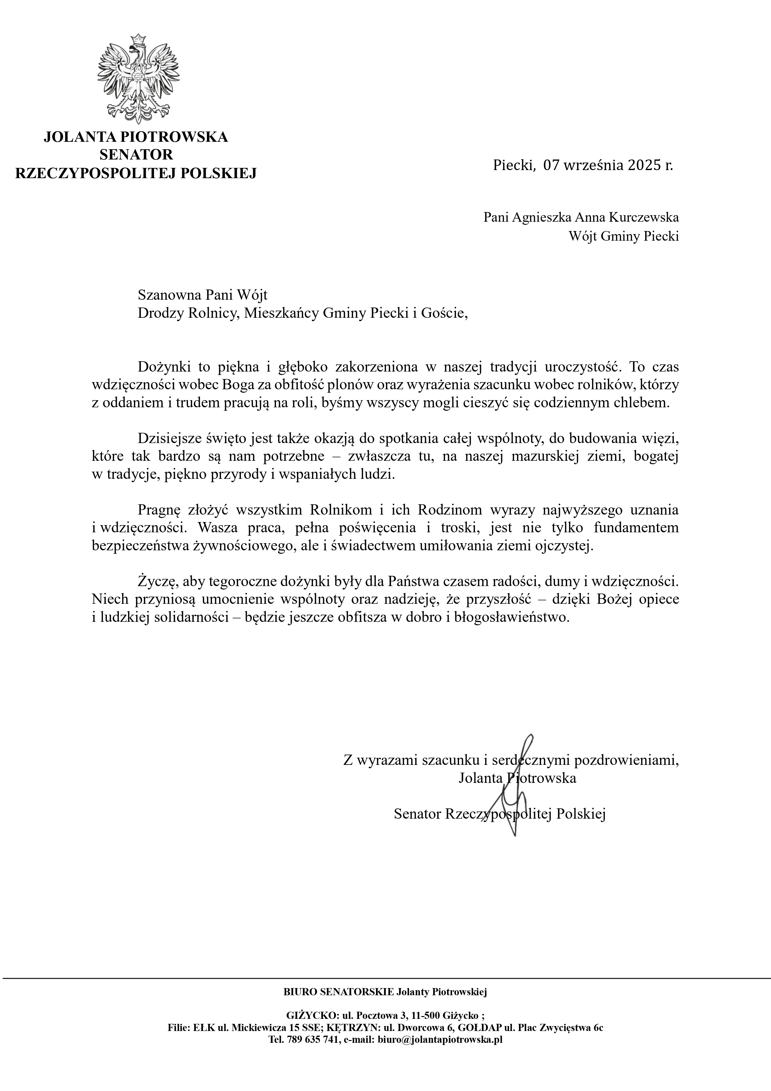 Życzenia z okazji zbliżających się DożynekArchiwum